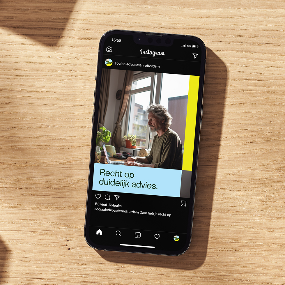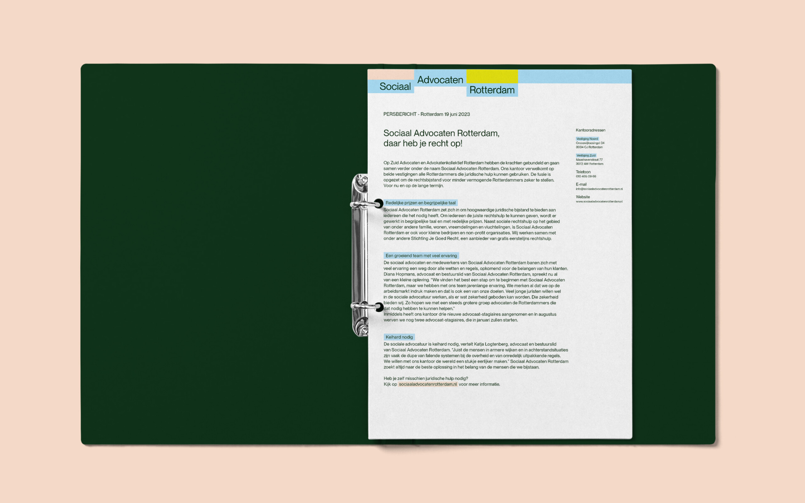 Friends for Brands heeft in nauwe samenwerking met Sociaal Advocaten Rotterdam een merkidentiteit ontwikkeld die past bij de passie en missie van het advocatenkantoor. De pay-off ‘daar heb je recht op.’ komt tot leven in de visuele stijl, waar gespeeld wordt met het rechtzetten van ‘onrechte’ vormen.